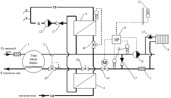 1 - сетчатый фильтр; 2 - датчик давления воды в трубопроводе; 4 - водоподогреватель системы ГВС; 8 - электронный регулятор; 9 - отопительный прибор; 10 - датчик температуры воды в трубопроводе; 11 - датчик температуры наружного воздуха; 12 - насос; 13 - регулятор перепада давления; 14 - регулирующий клапан с электроприводом; 15 - радиаторный терморегулятор; 17 - обратный клапан; 18 - ручной балансировочный клапан; 19 - регулятор температуры прямого действия.