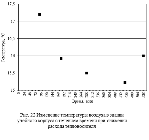 С целью определения тепловой инерции зданий и возможности регулирования температуры в них в ночное время и нерабочие дни, был поставлен эксперимент, заключающийся в уменьшении подачи теплоносителя и наблюдения за изменением температуры в здании с 18 оС до 14-15 оС и последующим возвратом к исходному состоянию. На рис. 21, 22 приведены результаты измерений для одного из корпусов ДФ НГТУ (здание выполнено из силикатного кирпича, введено в эксплуатацию в 1972 г). Как видно из рис. 21, 22 постоянная времени охлаждения здания по воздуху составляет 3 часа, а нагрева 1,5 часа. Это указывает на то, что можно снизить расход теплоносителя в ночное время и нерабочие дни до 12-14 оС и получать большую экономию тепловой энергии.