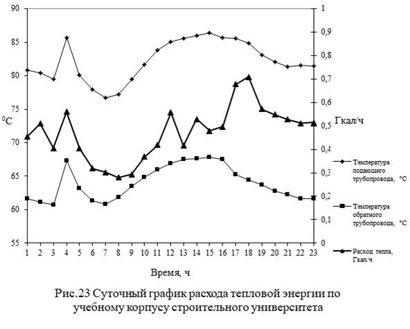 На рис. 23 приведены суточные графики расходов тепловой энергии по учебному корпусу строительного университета.