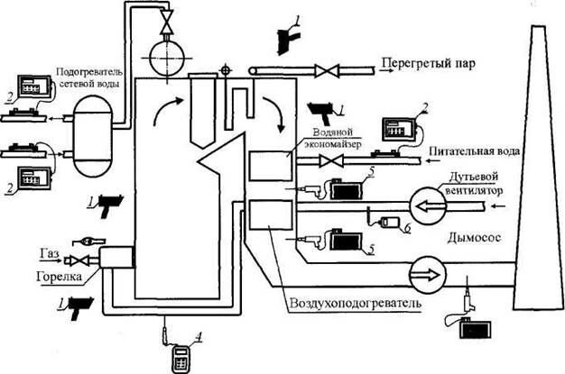 Рис. 9.4. Расположение приборов для наладки, испытаний и экологического контроля котельных установок: