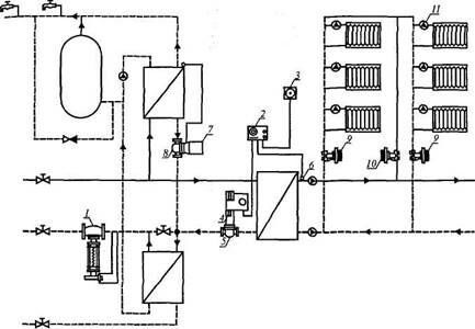 1 - регулятор давления; 2 — погодный компенсатор; 3 - наружный датчик темпера­туры; 4 - мотор с реверсивным двигателем; 5 - запорный клапан; 6 - датчики тем­пературы; 7,8- термостатический клапан; 9 - автоматический компенсационный клапан; 10 - ручной запорный клапан; 11 - радиаторный термостат