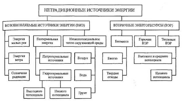 Нетрадиционные источники энергии делятся на возобновляемые (ВИЭ) и вторичные энергетические ресурсы (ВЭР).