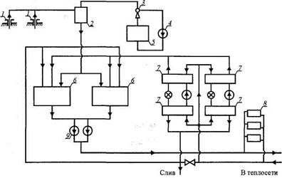 Геотермальный ЦТП расчетной теплопроизводительностью 5 МВт представлен на рис. 10.3. Геотермальная вода в ЦТП поступает от двух скважин с дебитом 45-70 м3/ч каждая и с температурой 70-74°С в два бака-аккумулятора 6. Для утилизации теплоты сбросной геотермальной воды работает парокомпрессионная теплонасосная установка 7.