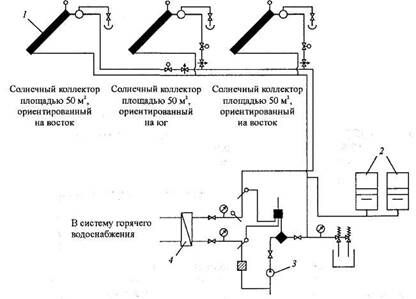 1 - солнечный коллектор; 2 - баки-аккумуляторы; 3 - циркуляционный насос; 4 — теплообменник