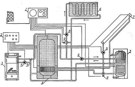 1 - система управления; 2 - система регулирования; 3 - котел; 4 - теплообменник-накопитель; 5 - солнечный бойлер; 6 - система отопления; 7 - солнечный коллектор; 8 - циркуляционный насос; 9 - смеситель