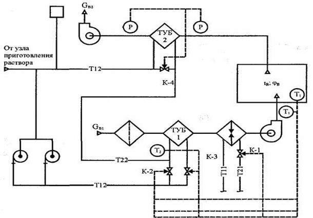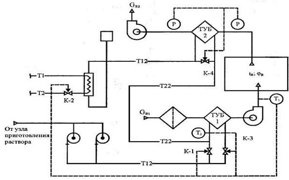 Система стабилизации температуры приточного воздуха обеспечивается датчиком Т-1 и клапаном К-2, установленным на обратном трубопроводе теплосети и сокращающим расход теплоносителя через водоподогреватель. Если клапан К-2 закрыт, а температура приточного воздуха увеличивается, то датчик Т-1 подает сигнал на клапан К-1, обеспечивающий перепуск горячего теплоносителя, минуя ТУБ-1 приточной установки.