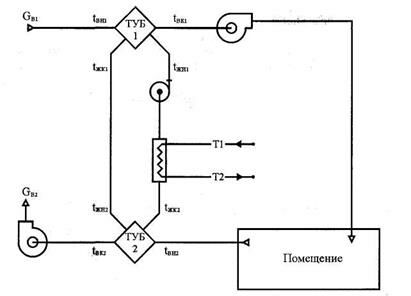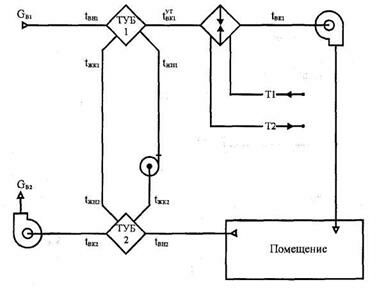 (ТУБ) группы т приточных или группы п вытяжных установок к циркуляционному контуру промежуточного теплоносителя.