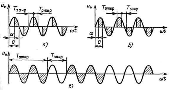 При широтно-импульсном управлении (рис. 12.46, в) в течение времени Тоткр на тиристоры подан открывающий сигнал, они открыты и к нагрузке приложено напряжение UH. В течение времени Тзакр управляющий сигнал снят и тиристоры закрыты. Действующее значение тока в нагрузке