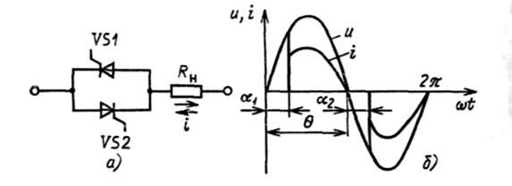 Рис. 16.2. Встречно-параллельное включение тиристоров (а) и форма тока при активной нагрузке (б)