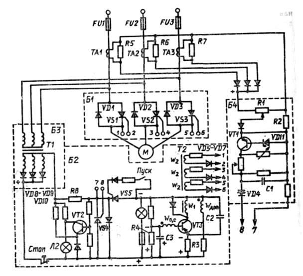 Блок Б4 защиты двигателя и силовых тиристоров от перегрузки питается от трансформаторов тока ТА1—ТАЗ. Напряжение с нагрузочных резисторов выпрямляется и подается на потенциометр R1. Параметры трансформаторов ТА1—ТАЗ и резисторов Rl, R5—R7 выбираются так что при номинальном токе во всех трех фазах напряжение, снимаемое с потенциометра R1, меньше напряжения пробоя стабилитрона VD11. До тех пор пока напряжение на стабилитроне меньше напряжения пробоя (1/<УПроб), сопротивление стабилитрона очень высоко. При этом ток базы транзистора VT1 недостаточен для его открытия. Если ток хотя бы в одной фазе превысит номинальное значение, то возникает неравенство U>U'проб, сопротивление стабилитрона резко падает, ток в базе VT1 возрастает и он насыщается. Ток в стабилитроне ограничивается резистором R2 до допустимого значения. Если восстановится неравенство U<UnJme, то сопротивление стабилитрона снова возрастет, транзистор VT1 закроется. После открытия транзистора VT1 начинается заряд конденсатора С1. Напряжение с конденсатора С1 на выход 7, 8 не подается до тех пор, пока не превысит напряжение переключения динистора VD4. Динистор имеет такую же вольт-амперную характеристику, как и тиристор при /у=0. Если перегрузка была настолько кратковременной, что конденсатор С2 не успел зарядиться, то напряжение на выходе 7, 5 не появится и пускатель останется в работе. Если Uc станет больше напряжения переключения динистора VD4, произойдет разряд конденсатора С1 на цепь управления тиристора VS4 блока Б2 и последний откроется. При этом прекратится генерация импульсов, открывающих VS1—VS3, и двигатель остановится. Параметр срабатывания блока защиты регулируется потенциометром R1. За счет усложнения блока защиты можно создать выдержку времени в зависимости от условия перегрузки. Защита двигателя и силовых тиристоров от токов КЗ в данном пускателе осуществляется быстродействующими предохранителями Fill—FU3 типа ПНБ-5.