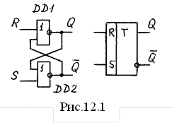 Асинхронный RS - триггер имеет два установочных входа R и S. Схема триггера на ЛЭ 2ИЛИ-НЕ и его условное обозначение показаны на рис.12.1. При S=R=0 схема устойчива. Это режим хранения информации. Если Q=1, то на входах DD2 оказываются 1 и 0, при которых