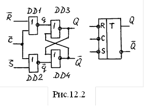 Синхронные RS - триггеры имеют два информационных входа R и S и синхровход С. Схема триггера и его условное обозначение показаны на рис.12.2. Асинхронный RS - триггер дополнен схемой управления на ЛЭ DD1-2, которая формирует сигналы