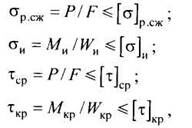 где Р – усилие, действующее на деталь, Н; F – площадь сечения детали, мм2; [σ]р.сж, [σ] – допускаемые напряжения на растяжение, сжатие и изгиб, Н/мм2; [τ]ср, [τ]кр – допускаемые напряжения на срез и кручение, Н/мм2; Ми, Мкр – изгибающий и крутящий моменты, Н · мм; WH, WKp – моменты сопротивления при изгибе и кручении, мм3.
