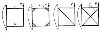 На рис. 4.6 прямоугольная рама закреплена своей левой стороной. Под воздействием силы Р элементы а и б рамы работают на изгиб. Повышение жесткости конструкции возможно введением косынок и диагональных элементов, работающих на растяжение и сжатие.