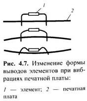 Вибрации, направленные ортогонально к плоскости печатной платы, попеременно изгибают ее и влияют на механическую прочность установленных на ней микросхем и ЭРЭ (компонентов). Если компоненты считать жесткими, то изгибаться будут их выводы (рис. 4.7). Большинство отказов компонентов происходит из-за поломки паяных соединений выводов с платой, потери герметизации. Наиболее жесткие воздействия имеют место в центре платы, а для прямоугольных плат еще и при ориентации тела элемента вдоль короткой стороны платы.