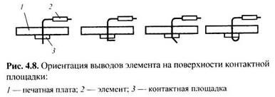 • подгибом и укладыванием выводов элементов на контактную площадку, что увеличивает длину и прочность сцепления паяного соединения (рис. 4.8);