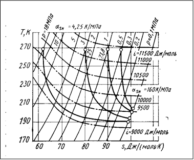 Это выражение является условием того, что искомая точка находится на кривой инверсии, а искомое давление равно давлению инверсии при данной температуре. Однако, в циклах с дросселированием практически (экономически) целесообразное давление сжатия может быть меньше давлений точки инверсии, например, в случае сжатия воздуха (при Т = 300 К ограничиваются давлением p » 20 МПа вместо 39 МПа). В гелиевых и водородных циклах с дросселированием оптимальные давления сжатия близки к давлениям инверсии.