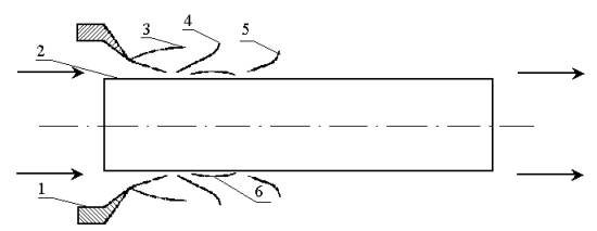 Почти чистый газообразный 3Не из вакуумного насоса 1 при р = 5 ... 6 кПа направляется в линию прямого потока. Газ последовательно охлаждается жидким гелием до Т = 4,2 К и конденсируется в ванне 2 с 4Не, кипящим при Т » 1,2 ... 0,8 К. Далее 3Не в жидкой фазе проходит капилляр (дроссель) 3, где его давление уменьшается (капилляр определяет расход 3Не) . После этого поток 3Не поступает в змеевик испарительной ванны 4 (Ти » 0,6 ... 0,7 К), где охлаждается, затем идет в теплообменник 5, в котором вновь охлаждается обратным потоком до температуры Тi, после чего поступает в смесительную ванну 6.