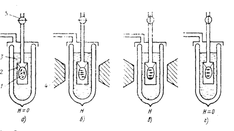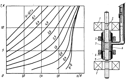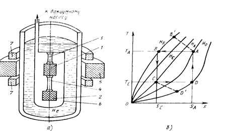 Намагничивание сверхпроводников. Переход металла из нормального в сверхпроводящее состояние сопровождается уменьшением энтропии, так как при этом упорядочивается электронная структура . Очевидно, что обратный процесс — снижение упорядоченности — приведет к поглощению теплоты. Такую систему можно использовать для охлаждения, реализуемого следующим образом. Образец предварительно охлаждают до температуры Tн, которая ниже температуры перехода в сверхпроводящее состояние Тc. После этого образец адиабатически изолируют и накладывают внешнее магнитное поле напряженностью Н, что приводит к его изоэнтропному переходу в нормальное состояние. Так как теплота поглощается от массы самого образца, то он охлаждается на DT = Тн — Тк.