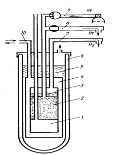 Аппарат состоит из сосуда Дьюара 6, в котором расположен вакуумный кожух 4. Внутри кожуха имеется сосуд 3, заполненный адсорбентом 2 (активированным углем). Охлаждаемая камера 1предназначена для экспериментальных целей. Сосуд Дьюара заполнен жидким водородом 5, а вакуумный кожух — теплообменным газом (гелием) для установления теплового контакта между жидкими водородом и адсорбентом. Охлажденный водородом адсорбент интенсивно поглощает газообразный гелий, поступающий по линии 9. Выделяющаяся теплота адсорбции поглощается жидким водородом; процесс изотермичен. Температура водорода является исходным уровнем процесса (То). Откачкой водорода из сосуда 3 вакуумным насосом по линии 7 можно обеспечить То до 10 К. Затем теплообменный газ удаляется вакуумированием по линии 10, адсорбент адиабатически изолируется, начинается десорбция гелия откачкой его вакуумным насосом через линию 8; в результате в изолированном сосуде 2 (с адсорбентом) температура падает до Tx » 4,0 К при Т0= 14 ... 10 К.