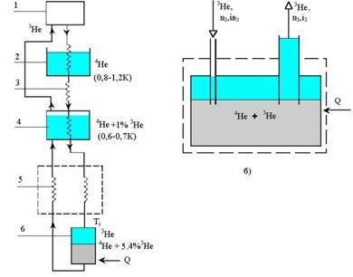 В смесительной ванне происходит расслоение фаз: почти чистый 3Не располагается в верхней части, а внизу концентрируется слабый раствор 3Не - 4He (»6,4 %3Не) Переход 3Не из верхней концентрированной фазы в раствор сопровождается ростом энтропии и, соответственно, поглощением теплоты; в адиабатных условиях это приводит к снижению температуры, а в изотермических — обеспечивает холодопроизводительность Q.