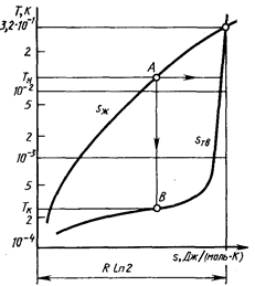 Полный процесс включает два этапа: а) предварительное ожижение ЗHe и начальное охлаждение его ниже 0,32 К, что обеспечивает состояние с более низкой энтропией, чем в твердой фазе при той же температуре (точка A); б) кристаллизация ЗHe изоэнтропным сжатием жидкости (процесс АВ), в результате которого температура падает на