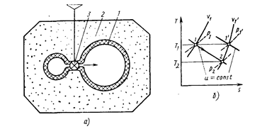Рис.2.4. Схема реализации процесса u = const (а) и его изображение в диаграмме T—S (б)