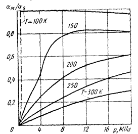 Доля эффекта охлаждения за счет внутренних сил aм по сравнению с общим эффектом охлаждения as зависит от давления и температуры. При р® 0 отношение aм/as ® 0, следовательно, внутренние силы не производят действия, так как молекулы удалены одна от другой. На рис. 2.5 приведены зависимости отношения aм/as от давления для воздуха при разных температурах.