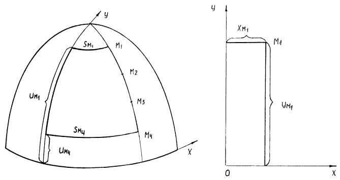Для построения развертки участка поверхности необходимо в выбранных осях координат (исходных линиях развертывания) определить координаты точек, лежащих на линиях членения поверхности – срезах развертки. Такими точками могут быть точки М1, М2, М3… Мi, лежащие на линии шва (рис. 2.2).