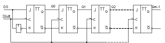 Пусть на рисунке триггер Q0 – младший , Qm-1 – старший; вход каждого триггера (кроме Q0) подключен к выходу соседнего младшего триггера. Когда на все С входы триггеров поступает активный спад сигнала Shift, выход каждого триггера принимает состояние своего младшего соседа и, таким образом, информация, содержащаяся в регистре, сдвигается на один разряд в сторону старших разрядов, влево. Триггер Q0 принимает при этом состояние последовательного входа DS (data serial). Информация, поступившая на вход DS во время какого-либо такта, появится на выходе Qm-1 через m тактов.