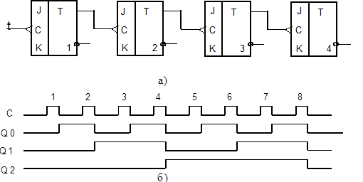 Рис. 4.9. Схема (а) и временные диаграммы (6) двоичного асинхронного суммирующего счетчика