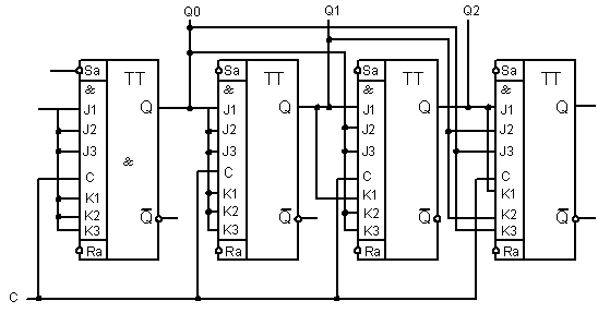 Синхронные счетчики называются еще счетчиками с параллельным переносом, т.к. в них входной переключающий сигнал непосредственно воздействует на все триггеры счетчика, что обеспечивает одновременность переходов триггеров.