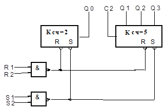Однако существуют и общие методы построения счетчиков с любым заданным Ксч. Один из этих методов заключается в немедленном сбросе в "0" счетчика, установившегося в комбинацию, соответствующую числу Ксч . Если, например, нам нужно построить счетчик на 5, то, сбрасывая двоичный трехразрядный счетчик на "0" каждый раз, когда он будет принимать состояние 101, мы обеспечим возврат счетчика в исходное состояние после каждых пяти входных импульсов.