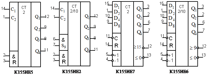 Условные обозначения асинхронных счетчиков К155ИЕ 5, К155ИЕ 2 и синхронных счетчиков К155ИЕ 7 и К155ИЕ 6 показаны на рис.4.13