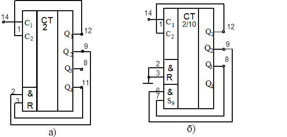 Подобный прием удобно применять при использовании счетчиков, имеющих элементы " И "на входах установки в "0" (К155ИЕ 5 и К155ИЕ 2) и в "9" (К155ИЕ 2). В качестве примера на рис.4.14 показаны соединения для получения Ксч = 10 для счетчика К155ИЕ 5 и Ксч = 7 для счетчика KI55ИЕ 2. В последнем случае из десяти состояний исключается три состояния (0110, 0111 и 1000).