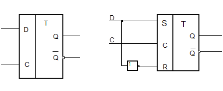 На рис. 4.3, б показан универсальный способ построения D-триггера из синхронного RS-триггера: с помощью инвертора 1 однофазный вход данных D превращается в парафазный и подается на S- и R -входы.