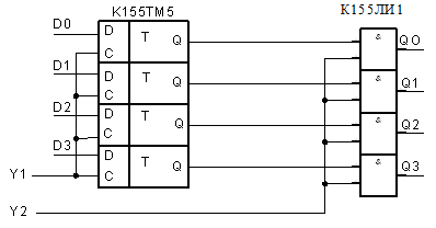На рис. 4.6 показана схема четырехразрядного регистра, выполненного на ИМС К155ТМ5 и К155ЛИ1.