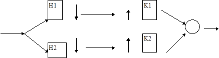 . Рассмотрим следующую схему, изображенную на рисунке. Входной сигнал подается на два фильтра. Стрелки вниз означают выбрасывание сигнала с нечетными номерами, а стрелки вверх - включение нулевого сигнала между двумя приинятыми. После этого полученные сигналы фильтруются двумя фильтрами и складываются.