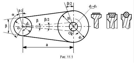 Ременная передача состоит из ведущего и ведомого шкивов, соединенных ремнем. Ремни бывают плоские, клиновидные и круглые (рис. 11.1). Нагрузка передается силами трения между шкивом и ремнем. При геометрическом расчете обычно известны d1 и d2 – диаметры шкивов и межосевое расстояние  а. Определяется угол охвата ремнем малого шкива α через угол между ветвями ремня β и длину ремня l. Вследствие вытяжки и провисания ремня, величины  α и l не являются строгими и определяются приближенно. Из рис.11.1 видно, что α=1800-β. Проведем из О1 линии параллельно ремню. Они отсекут на диаметре d2 окружность d2 - d1. Из ∆О1О2В видно, что  так как , то т.е.