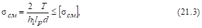 У стандартных шпонок размеры b и h подобраны так (рис. 21.3), что нагрузку соединения ограничивают не напряжения среза, а напряжения смятия, поэтому при проверочных расчетах обычно используют формулу (21.1).