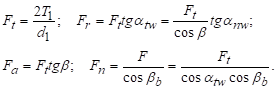 Усилия для косозубого зацепления можно записать в следующем виде: