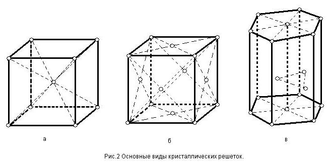 На рис. 2 изображены элементарные ячейки для наиболее распространенных кристаллических решеток. В кубической объемно-центрированной решетке (рис. 2, а) атомы расположены в ушах ячейки и один атом в центре куба.