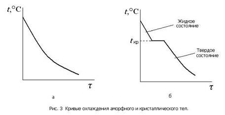 Кристаллизация металлов. Процесс образования в металлах кристаллической решетки называется кристаллизацией. Для изучения процесса кристаллизации строят кривые охлаждения металлов, которые показывают изменение температуры (t) во времени (τ). На рис. 3 приведены кривые охлаждения аморфного и кристаллического веществ. Затвердевание аморфного вещества (рис. 3, а) происходит постепенно, без резко выраженной границы между жидким и твердым состоянием- На кривой охлаждения кристаллического вещества (рис. 3, б) имеется горизонтальный участок с температурой tкр, называемой температурой кристаллизации. Наличие этого участка говорит о том, что процесс сопровождается выделением скрытой теплоты кристаллизации. Длина горизонтального участка — это время кристаллизации.