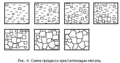 Кристаллизация металла происходит постепенно. Она объединяет два процесса, происходящих одновременно: возникновение центров кристаллизации и рост кристаллов. В процессе кристаллизации когда растущий кристалл окружен жидкостью, он имеет правильную геометрическую форму. При столкновении растущих кристаллов их правильная форма нарушается (рис. 4). После окончания кристаллизации образуются кристаллы неправильной