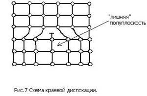 Линейные дефекты имеют малые размеры в двух измерениях и большую протяженность в третьем. Эти дефекты называют дислокациями. Краевая дислокация (рис. 7) представляет собой искажение кристаллической решетки, вызванное наличием «лишней» атомной полуплоскости.