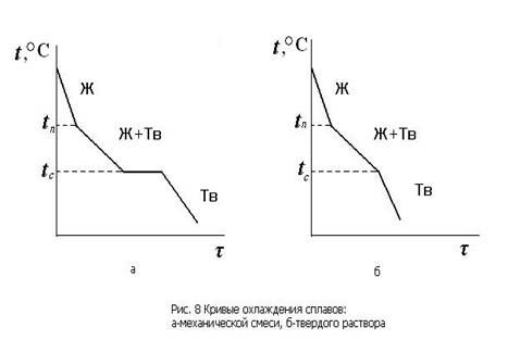 Диаграмма состояния. Диаграмма состояния показывает строение сплава в зависимости от соотношения компонентов и от температуры. Она строится экспериментально по кривым охлаждения сплавов (рис. 8). В отличие от чистых металлов сплавы кристаллизуются не при постоянной температуре, а в интервале температур. Поэтому на кривых охлаждения сплавов имеется две критические точки. В верхней критической точке, называемой точкой ликвидус (tл), начинается кристаллизация. В нижней критической точке, которая называется точкой солидус (tc), кристаллизация завершается. Кривая охлаждения механической смеси (рис. 8, а) отличается от кривой охлаждения твердого раствора (рис. 8, б) наличием горизонтального участка. На этом участке происходит кристаллизация эвтектики. Эвтектикой называют механическую смесь двух фаз, одновременно кристаллизовавшихся из жидкого сплава. Эвтектика имеет определенный химический состав и образуется при постоянной температуре.