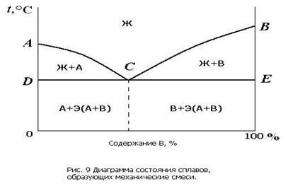 Виды диаграмм состояния. Диаграмма состояния сплавов, образующих механические смеси (рис. 9), характеризуется отсутствием растворения компонентов в твердом состоянии. Поэтому в этом сплаве возможно образование трех фаз: жидкого сплава Ж, кристаллов А и кристаллов В. Линия АСВ диаграммы является линией ликвидус: на участке АС при охлаждении начинается кристаллизация компонента А, а на участке СD — компонента В. Линия DСВ является линией солидус, на ней завершается кристаллизация А или В и при постоянной температуре происходит кристаллизация эвтектики Э. Сплавы концентрация которых соответствует точке С диаграммы называются эвтектическими, их структура представляет собой чистую эвтектику.