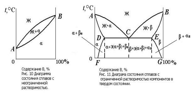 Диаграмма состояния сплавов с неограниченной растворимостью компонентов в твердом состоянии изображена на рис. 10. Для этого сплава возможно образование двух фаз: жидкого сплава и твердого раствора а. На диаграмме имеется всего две линии, верхняя является линией ликвидус, а нижняя — линией солидус.