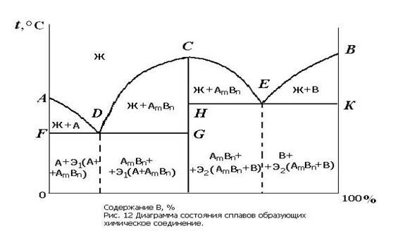 Диаграмма состояния сплавов, образующих химическое соединение (рис. 12) характеризуется наличием вертикальной линии, соответствующей соотношением компонентов в химическом соединении АmВn. Эта линия делит диаграмму на две части, которые можно рассматривать как самостоятельные диаграммы сплавов, образуемых одним из компонентов с химическим соединением. На рис. 12 изображена диаграмма для случая, когда каждый из компонентов образует с химическим соединением механическую смесь.