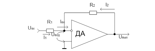I1 = -I2; I1 = Uвх/R1; I2 = Uвых/R2